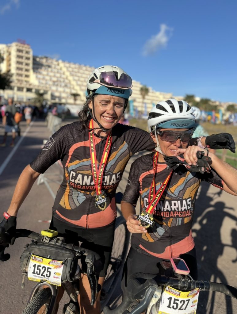Esta foto fue sacada en la meta de Fudenas el 25 de octubre de 2025. Después de 152 km, se ve la emoción de las dos únicas y primeras participantes en modalidad gravel que supieron superar este enorme reto teniendo en cuenta la competividad de esta prueba pero priorizando el compañerismo y el apoyo de equipo.