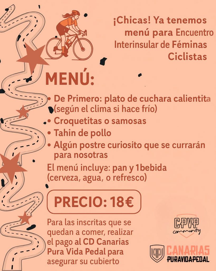 AVITUALLAMIENTOS: La CPVP Community y el Club Canarias Puravidapedapedal tendrán la gentileza de aportar avituallamientos liquidos y sólidos, tanto el sábado como el domingo; no obstante, sugerimos a las participantes que lleven algo más de aporte como sus barritas y geles por si lo necesitaran en algún otro punto de la ruta. Incluso a razón de las posibles intolerancias de cada participante.